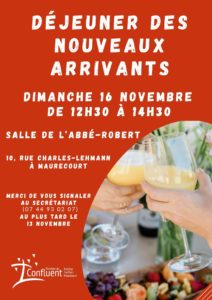 Accueil des nouveaux arrivants  : signalez vous au secrétariat, la paroisse s’occupe du plat chaud et vous êtes invités à apporter quelque chose pour l’entrée ou le dessert !