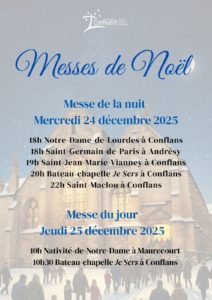 Pendant les vacances scolaires, messe unique en semaine tous les jours à St Maclou Conflans à 9h sauf le lundi